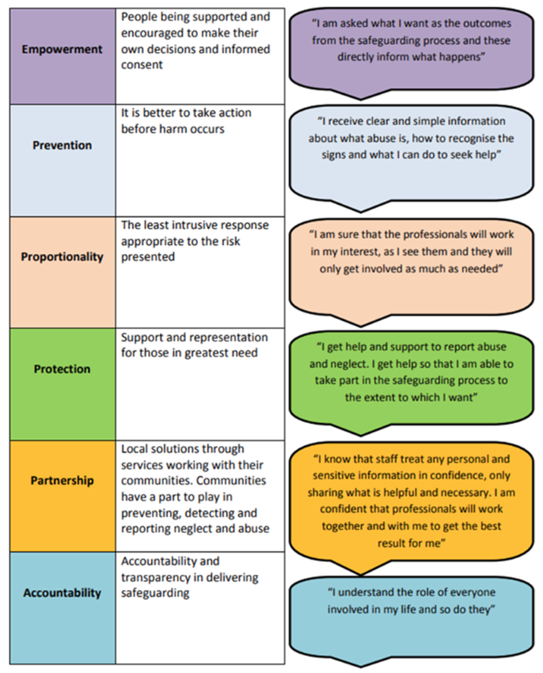 The Care Act statutory guidance defines 6 principles that should underpin all safeguarding functions, actions and decisions: